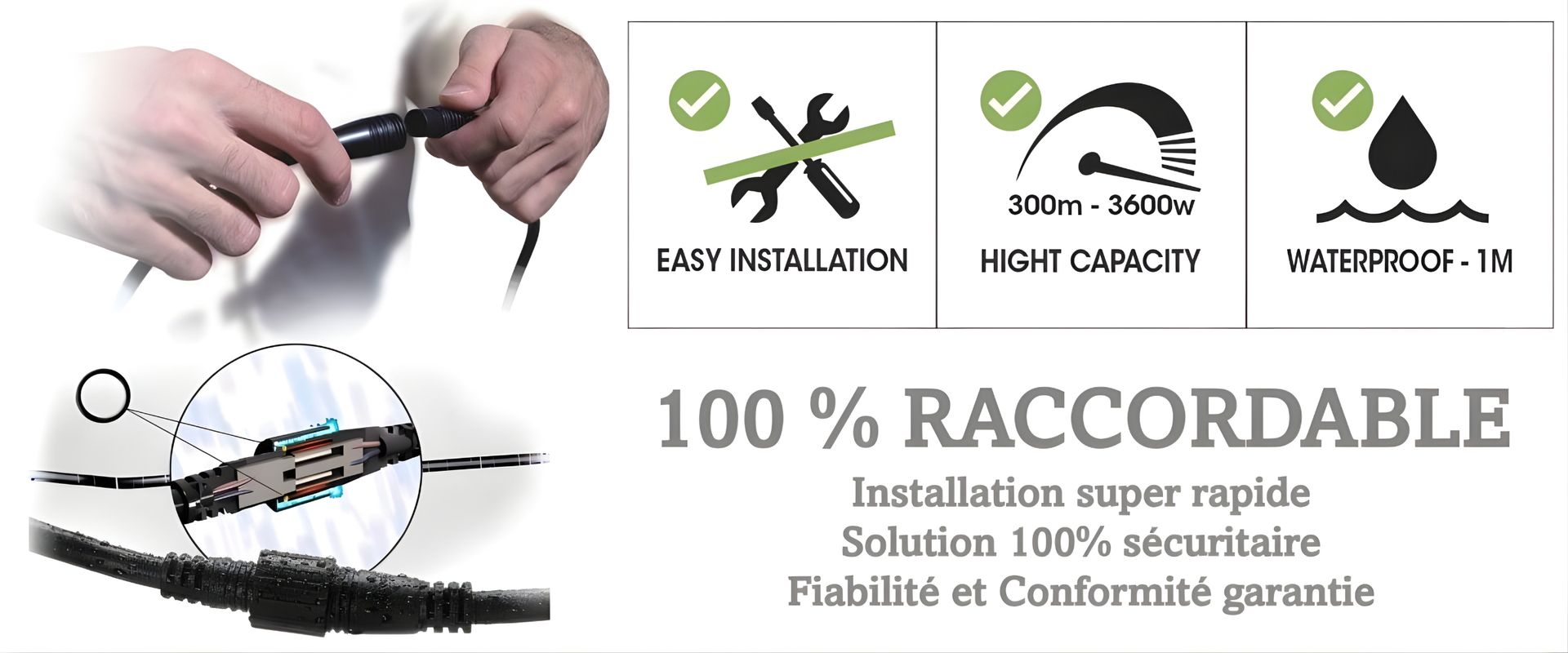 Pionnier et N°1 incontestable sur le marché de l'éclairage raccordable extérieur 230~250V ce concept créé en 2007 sous le nom d'usage EASY CONNECT est devenu grâce à son connecteur exceptionnel la solution la plus complète, autant par les performances et la sécurité, que par le large choix de produits qui peuvent être ajoutés.