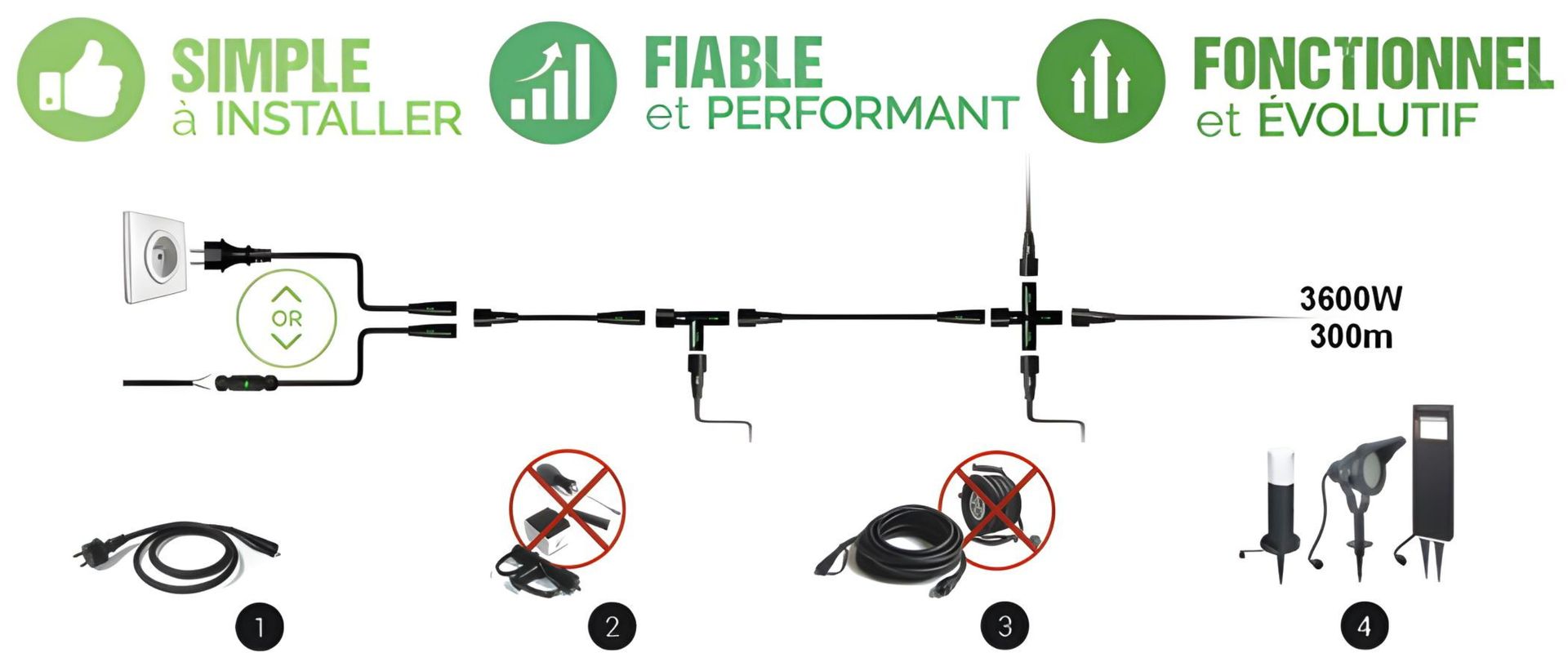 C'est aussi le seul système en Europe permettant à un professionnelle "non électricien", ou un particulier d'installer un réseau complet d'éclairage de jardin en conformité avec les normes et les conditions d'utilisations .