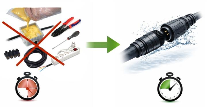 Fini les branchements électriques complexes et chronophages, toutes les étapes qui consistaient à dénuder les fils, mettre des dominos dans des boitiers étanches et couler de la résine sont désormais remplacées par les connecteurs brevetés PRO CONNECT, ils permettent de créer des réseaux d’éclairage de jardin complets en un rien de temps.